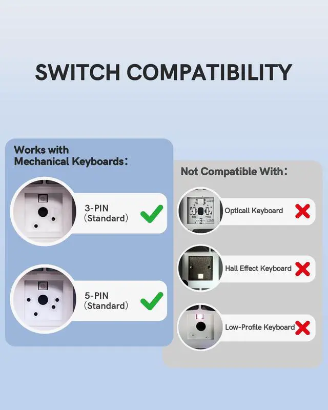 • MX-Compatible Design With standard MX-compatible construction, these mechanical switches fit most MX-style mechanical keyboards and keycaps. This compatibility makes them a versatile choice for upgrading or customizing various keyboard models.