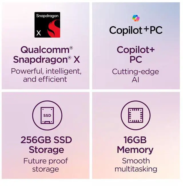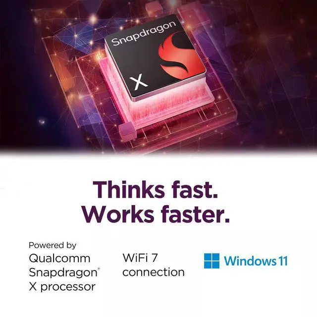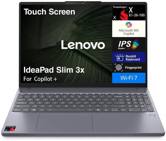 Model: Lenovo IdeaPad Slim 3xForm/Style: StandardProcessor: Snapdragon X X1-26-100 2.90GHz Processor (upto 3.1 GHz, 24MB Cache, 8-Cores, 8-Threads, )Memory: 16GB OnBoard LPDDR5X RAMGraphics: Qualcomm Adreno Integrated Graphics, Storage: 512GB 2242 PCIe SSD (Solid State Drive)Operating System: Windows 11 Pro-64Display: 15.3" IPS WUXGA (1920x1200) 60Hz 16:10 Touchscreen DisplayConnectivity: 802.11be, Bluetooth 5.4, Ports/Slots:, HDMI, USB 3.2 Type-C, SD Card Reader, Headphone/Microphone Combo JackInput/Output: Webcam, Fingerprint, Grey, Backlit KB Standard Keyboard, Battery: 65W PSU, 3-Cell 60 WHr BatteryOther Features, Color: Luna GreyWeight: 3.5lbProduct Dimensions (WxLxH): 9.5 IN x 13.5 IN x 0.7 IN1 Year Manufacturer warranty from Velztorm (Professionally upgraded by Velztorm)