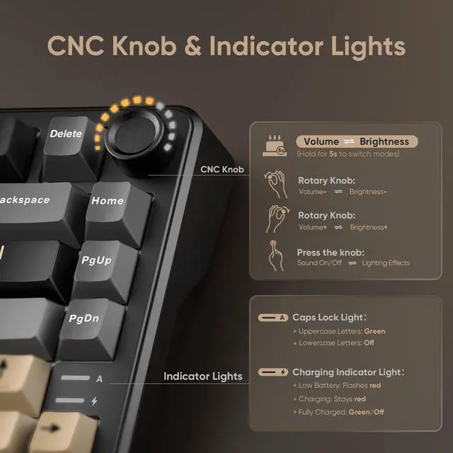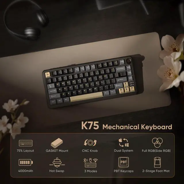 JAYSUING K75 Wireless Mechanical Keyboard,Tri-Mode BT5.0/2.4GHz/USB-C Hot Swappable Custom Keyboard,Pre-lubed Linear Switches,Gasket Structure,RGB Backlit Gaming Keyboard for PC/Tablet/PS/Xbox Support macro programming, macro definition, custom lighting, and side illumination Light up your gaming desk JAYSUING K75 Wireless RGB Mechanical Gaming Keyboard JAYSUING Wireless Mechanical Keyboard, RGB Backlit Rechargeable Battery, 2.4G/USB/BT Mode, 75% Layout TKL Ultra Compact Mechanical Gaming Keyboard (White) JAYSUING K75 Wireless RGB Mechanical Gaming Keyboard - The ultimate gaming companion that combines cutting-edge features with unrivalled performance. Designed with an ANSI layout, RGB backlighting and an ergonomic 75% layout, this mechanical keyboard sets a new standard for gaming excellence. The JAYSUING K75 comes with hot-swappable Gateron mechanical switches, delivering crisp, responsive and tactile feedback for both gaming and typing. It supports full N-Key Rollover, ensuring every keystroke is registered accurately even during intense gameplay. With dynamic RGB underglow lighting, the JAYSUING K75 creates an immersive gaming atmosphere that can be fully customised to match your style. The built-in volume knob allows quick and convenient control without interrupting your game. The compact 75% TKL design saves desktop space while retaining all essential functions, making it ideal for any gaming setup. Experience true freedom with 3 connection modes: 2.4G wireless, Bluetooth 5.0 and TypeC wired. This mechanical keyboard offers stable, low-latency performance and wide compatibility across multiple devices. Gasket-mounted structure enhances durability and provides a smooth, premium typing experience. The spill-resistant design adds extra reliability during long gaming sessions. Built with high-quality components, the JAYSUING K75 is durable and built to last. It supports plug-and-play for easy setup, while the customisable RGB backlight lets you personalise brightness, speed and effects freely. Elevate your setup with the JAYSUING K75 Wireless RGB Mechanical Gaming Keyboard. Immerse yourself in full customisation, precise control and pro-level performance. Upgrade to the K75 and experience mechanical gaming like never before. JAYSUING K75 Mechanical Keyboard Side-Engraved & Premium Performance JAYSUING K75 wireless mechanical keyboard integrates compact design, mechanical precision and stylish aesthetics, built for users who demand durability, performance and visual appeal. The 75% compact layout keeps all functional keys while eliminating redundant space, maximising your desktop area. The keyboard uses side-engraved keycap technology to prevent character wear and fading, making it perfect for long hours of gaming and working. It is available in Gradient Gray and Contour White, with vibrant RGB backlighting that balances practicality and style. Mechanical Switches & Side-Engraved Keycaps The keyboard features durable, hot-swappable mechanical switches for responsive, consistent and satisfying keystrokes. The side-engraved character design resists fading even with heavy daily use, and characters stay clear and visible under RGB lighting for easy recognition. 3 Connection Modes & Dual System Compatibility This mechanical keyboard supports BT5.0 / 2.4G / wired three connection modes for seamless switching. 2.4G offers stable, low-interference transmission up to 10m, ideal for competitive gaming.