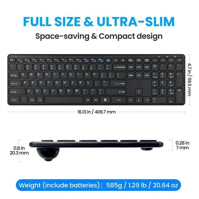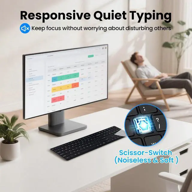 Whisper-Quiet Typing Designed with smooth short-throw, laptop-style keys, this wireless keyboard minimizes noise for a quieter, more comfortable typing experience. Perfect for shared spaces, offices, or late-night work—type and click without disturbing others.