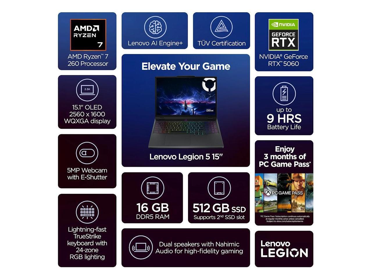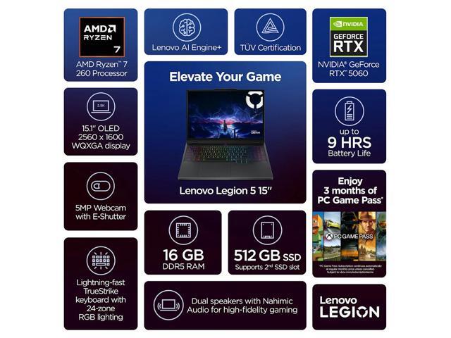 Lenovo Legion 5 Gaming Laptop, 15.1" WQXGA OLED 165Hz 500 Nits Display, AMD Ryzen 7 260 (Up to 5.1 GHz), GeForce RTX 5060 8GB GDDR7, 32GB DDR5 2TB SSD, 24 Zone RGB Backlit KB, WiFi 7, Win11 Home