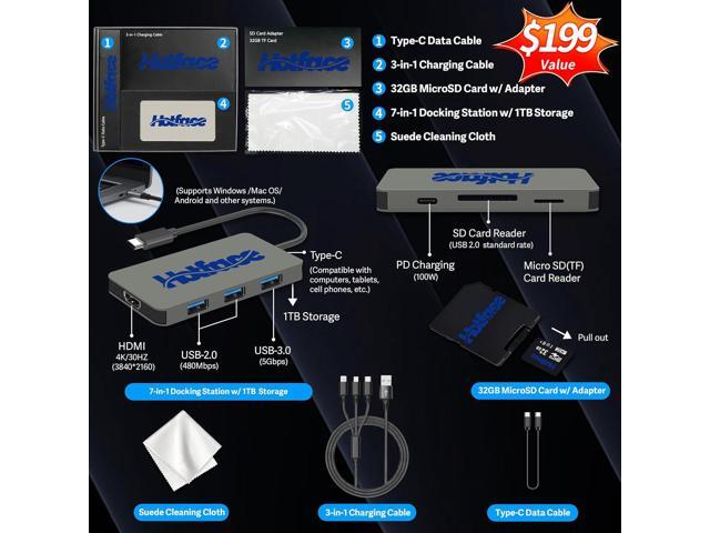 - Bonus Docking Station Set:1x 7-in-1 Docking Station with 1TB Storage, 1x 32GB MicroSD Card with Adapter, 1x Type-C Data Cable, 1x 3-in-1 Charging Cable, 1x Suede Cleaning Cloth.