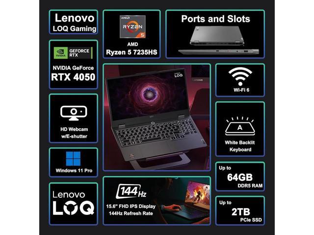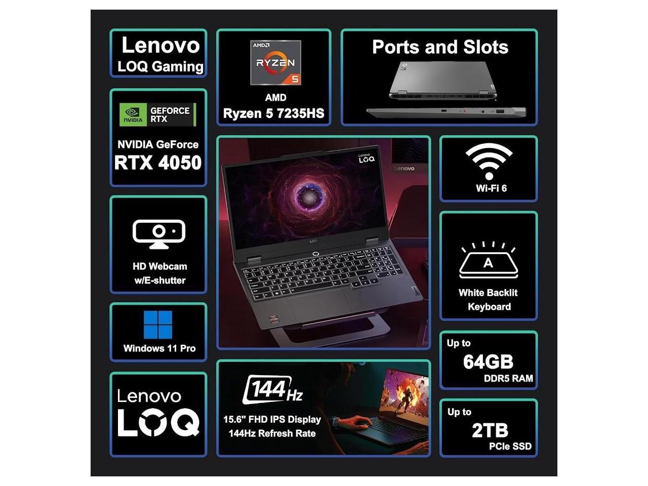 [Feature]: Lenovo LOQ gaming laptop backed by AMD Ryzen 5 7235HS Processor that run heavy PC games and video-editing applications smoothly, as well as numerous programs all at once. NVIDIA GeForce RTX 4050 Graphics TGP 115W backed by 6GB GDDR6 dedicated video memory to fuel your games, DLSS (Deep Learning Super Sampling), Ray tracing.