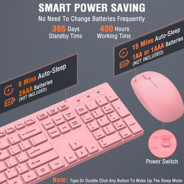 The mouse has a power switch, but the keyboard does not. However, the keyboard will automatically enter sleep mode after six minutes of inactivity to save power.