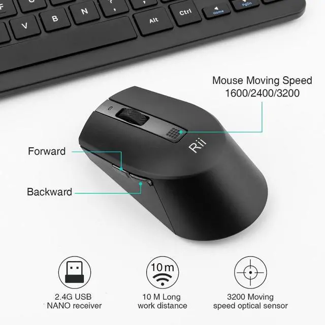 2.4G Wireless Mouse Specification: Receiver(dongle):Nano style Left and Right Button life:10 Million Clicks 3 moving speed levels:1600-2400-3200. Working Range:up to 10 meters Dimension:11.3cm x 6.4cm x 4cm