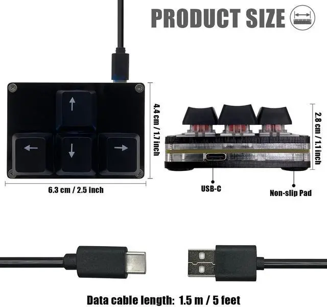 Portable Mini Keyboard < br > Ultra-small size,attached detachable USB-C cable,effectively saves desktop space. You can connect the mini keyboard (plug and play) and a normal-size keyboard with the same computer at the same time, they will not interfere with each other.< br > Default function < br > The default function of four keys is Up,Left,Down,Right.Plug and play,No software needed.Makes workflow super fast.< br > Other function < br > You can also use other functions, such as Shortcut keys, Multi-step operation, Multi-key in one, Undo, Redo, Play, Pause, Volume, Switch song, Forward, Backward, etc. You can control the light color and gradient mode of the case you want through the software or website.< br > Programming by Software < br > The Software is only for Windows System.Sometimes Windows Firewall will issue a warning when it starts.Don't worry,the Software is very safe! Software:https://dl.sayobot.cn/setting.zip< br > Programming by Website < br > The Website is applicable to MacOS,Linux and also Windows Systems.We recommend that you try to use Chrome and Edge Browser to access the website! Website:SayoDevice.com< br > Device < br > Programming will be saved on the device. You don't need to set it up again when you change the computer.If you encounter any problems with the keypad, please contact us, we will help you deal with it as soon as possible.