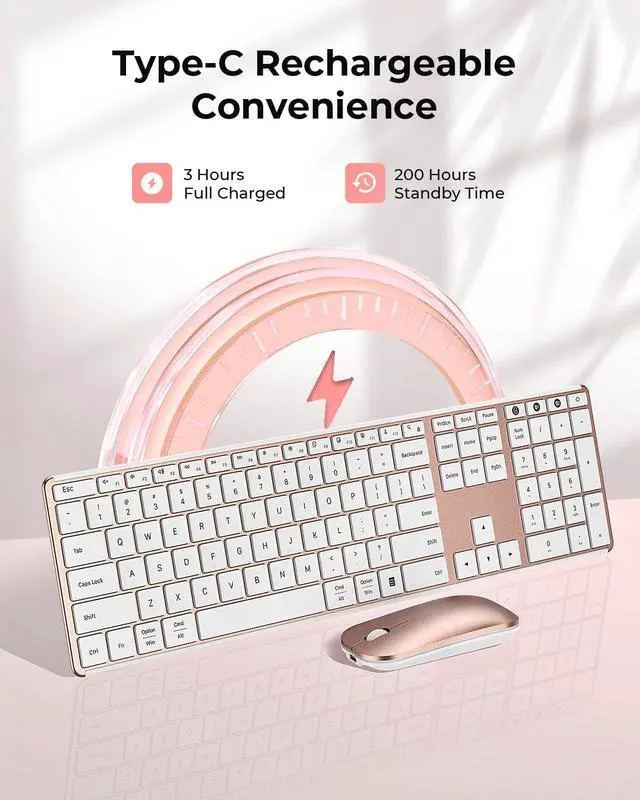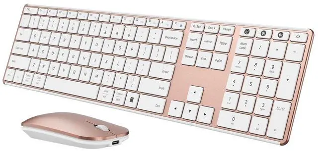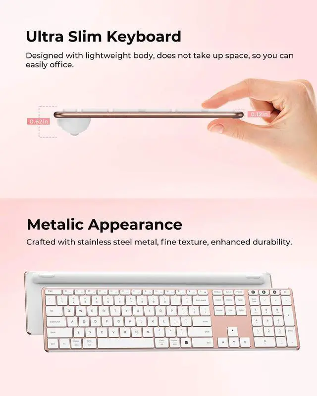 If you are looking for a slim, sleek, and lightweight keyboard and mouse for office, study or present, this would be a good choice. Ultra-thin design with only 0.12inch for keyboard and 0.9inch for mouse, high-quality metal panel and black & rose gold color, which makes your desk modern and simple.