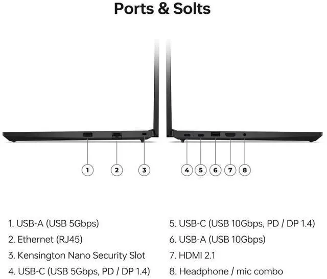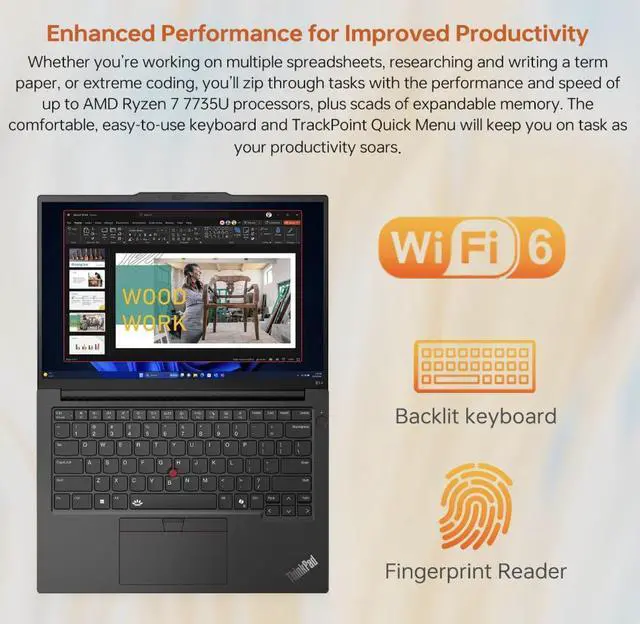 Model: Lenovo ThinkPad E14Form/Style: StandardProcessor: Zen 3 Gen Ryzen 7 7735U 2.70GHz Processor (upto 4.7 GHz, 16MB Cache, 8-Cores, 16-Threads, )Memory: 32GB DDR5 SO-DIMMGraphics: AMD Radeon 680M Integrated Graphics, Storage: 2TB PCIe SSD (Solid State Drive)Operating System: Windows 11 Pro-64Display: 14.0" IPS WUXGA (1920x1200) 60Hz 16:10 DisplayConnectivity: 802.11ax Wifi, Bluetooth 5.3, RJ-45Ports/Slots:, HDMI, USB 3.1 Type-C, USB 3.2 Type-C, Headphone/Microphone Combo JackInput/Output: Webcam, Fingerprint, Black, Backlit KB Standard Keyboard, Battery: 65W PSU, Type-C Power-In, 3-Cell 47 WHr BatteryOther Features, Color: BlackWeight: 3.2lbProduct Dimensions (WxLxH): 8.9 IN x 12.4 IN x 1 IN1 Year Manufacturer warranty from Velztorm (Professionally upgraded by Velztorm)
