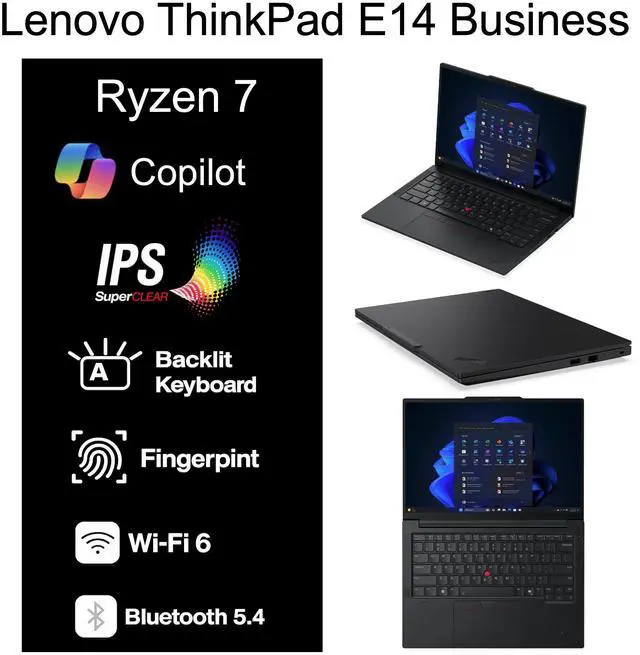 Model: Lenovo Thinkpad E14Form/Style: StandardProcessor: Zen 4 Gen Ryzen 7 250 3.30GHz Processor (upto 5.1 GHz, 16MB Cache, 8-Cores, 16-Threads, )Memory: 32GB DDR5 SO-DIMMGraphics: AMD Radeon 780M Integrated Graphics, Storage: 1TB PCIe SSD (Solid State Drive)Operating System: Windows 11 Pro-64Display: 14.0" IPS WUXGA (1920x1200) 60Hz 16:10 DisplayConnectivity: 802.11ax Wifi, Bluetooth 5.4, RJ-45Ports/Slots:, HDMI, USB 3.2 Type-C, Headphone/Microphone Combo JackInput/Output: Webcam, Fingerprint, Black, Backlit KB Standard Keyboard, Battery: 65W PSU, Type-C Power-In, 3-Cell 48 WHr BatteryOther Features, Color: Weight: 3.1lbProduct Dimensions (WxLxH): 8.9 IN x 12.4 IN x 0.9 IN1 Year Manufacturer warranty from Velztorm (Professionally upgraded by Velztorm)