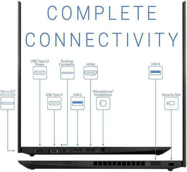 GENERAL INFORMATION Brand: Lenovo Series: ThinkPad Model: T490s Form Factor: Notebook Operating System: Windows 10 Pro DISPLAY Display Size: 14" Resolution: FHD (1920 x 1080) Touch: Multi-touch Display Display Features: IPS Webcam: Yes - 720p PROCESSOR Processor Brand: Intel Processor Type: Core i7-8665U Number of Cores: 4 Base Frequency: 1.90GH z Turbo Frequency: 4.8GH z SmartCache: 8MB MEMORY Memory Capacity: 32GB (Soldered on board) Memory Type: DDR4 Memory Speed: 2400 Max Supported Memory: 32 GB STORAGE Drive Capacity: 1TB Drive Type: NVMe SSD (PCIe) VIDEO Integrated Graphics: Intel UHD Graphics AUDIO Audio Tech: HD Audio Speakers: Stereo Speakers PORTS & FEATURES Video Ports: 1x HDMI, 1x Thunderbolt 3 Audio Ports: 1 x Headphone/Microphone Combo Jack USB Ports: 2x USB 3.1 Gen 1, 2x USB-C 3.1 Gen 1 Card Reader: Micro SD Security Slot: Yes Keyboard: Backlit COMMUNICATIONS Wi-Fi: Wi-Fi 5 ( 802.11 ac) Bluetooth: Bluetooth 5.0 POWER AC Adapter: 65-watt Battery: 3-cell lithium ion Battery Life: > 5 hours PHYSICAL SPECIFICATIONS Length: 8.9 in. Width: 12.95 in. Height: 0.63 in. Weight: 2.98 lbs Color: Black