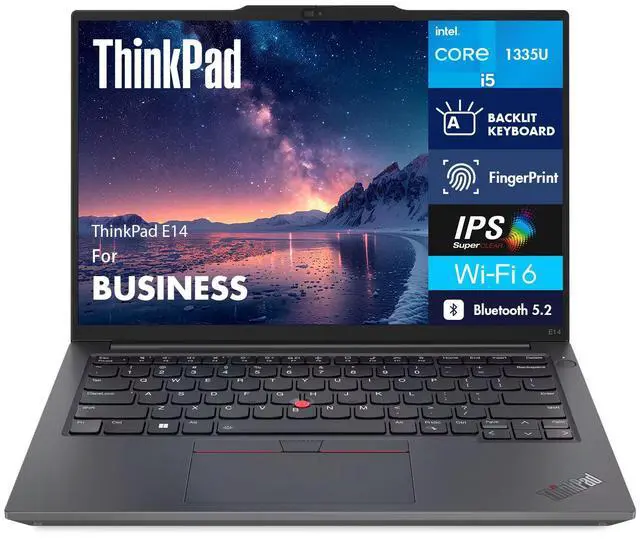 Model: Lenovo ThinkPad E14Form/Style: StandardProcessor: 13th Gen Intel Core i5-1335U 1.30GHz Processor (upto 4.6 GHz, 12MB Cache, 10-Cores, 12-Threads, 2 Performance-cores)Memory: 16GB DDR4 RAM (8GB Onboard + 8GB SO-DIMM)Graphics: Intel Iris Xe Integrated Graphics, Storage: 256GB PCIe SSD (Solid State Drive)Operating System: Windows 11 Pro-64Display: 14.0" IPS WUXGA (1920x1200) 60Hz 16:10 DisplayConnectivity: Wi-Fi 6 AX201 Wifi, Bluetooth 5.2, RJ-45Ports/Slots:, 1 USB 2.0, 1 x HDMI 2.1, Thunderbolt 4, USB 3.2 Type-C, Headphone/Microphone Combo JackInput/Output: Webcam, Fingerprint, Black, Backlit KB Standard Keyboard, Battery: 65W PSU, Type-C Power-In, 3-Cell 47 WHr BatteryOther Features, Color: Graphite BlackWeight: 3.3lbProduct Dimensions (WxLxH): 8.6 IN x 12.3 IN x 0.75 IN