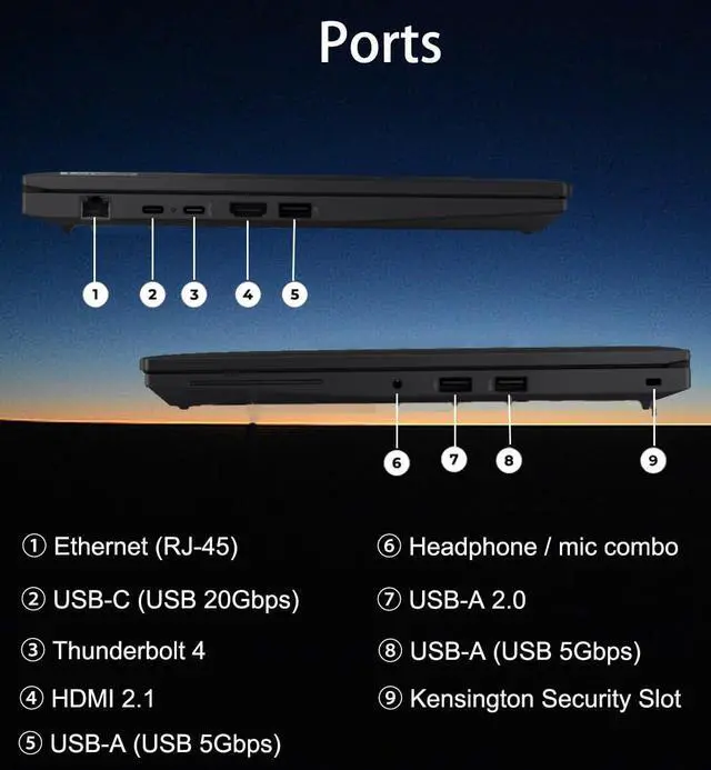 Thunderbolt 4, with USB PD 3.0 and DisplayPort 2.1 | USB-C (USB 20Gbps / USB 3.2 Gen 2x2), with USB PD 3.0 and DisplayPort 1.4 | 2 x USB-A (USB 5Gbps / USB 3.2 Gen 1) | USB-A 2.0 | HDMI 2.1, up to 4K/60Hz | Ethernet (RJ-45) | Headphone / microphone combo jack
