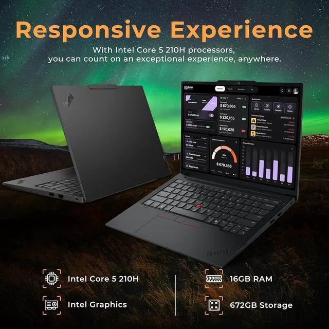 The Lenovo ThinkPad E14 Gen 7 features a 14" WUXGA display, Intel Core 5 210H processor, Intel Graphics, a backlit keyboard, and a fingerprint reader for secure, everyday productivity.