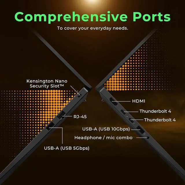 Windows 11 Pro: 12.32"x8.68"x0.6", 2.95lbs. Ports: 2x USB-A, 2x USB-C, 1x HDMI, 1x Headphone/ mic combo, 1x RJ-45. Wi-Fi 6E+Bluetooth. Bonus Docking Station Set: 1x 7-in-1 Docking Station w/ 128GB Storage, 1x 32GB MicroSD Card w/ Adapter, 1x Type-C Data Cable, 1x 3-in-1 Charging Cable, 1x Suede Cleaning Cloth.