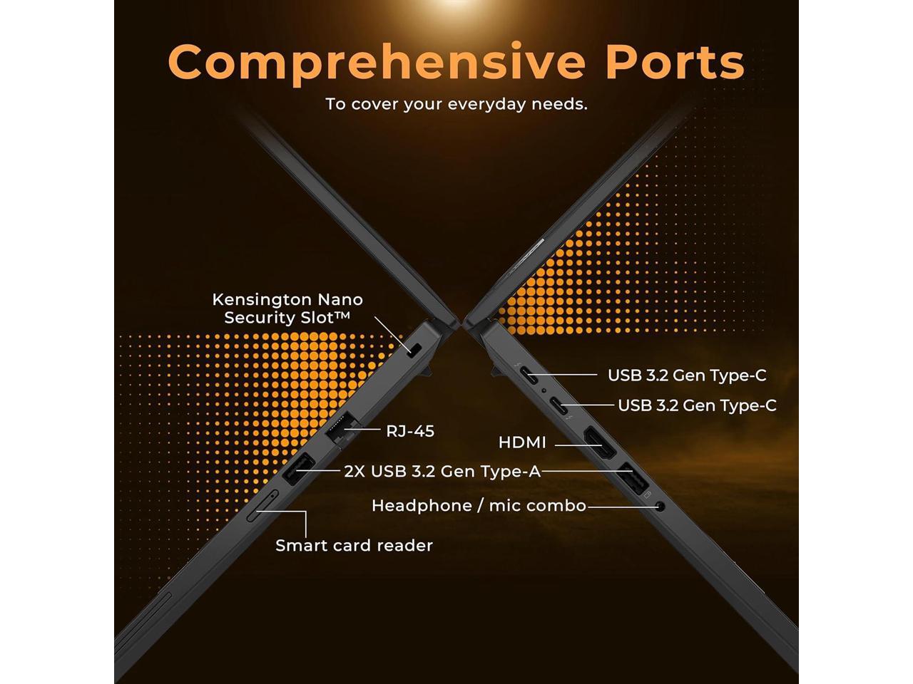 Windows 11 ProDimensions12.44" x 8.81" x 0.7", 2.96 lbs. Ports2 x USB-A 3.2, 2 x USB-C 3.2, 1 x HDMI, 1 x Headphone Jack, 1 x Smart Card Reader, 1 x RJ-45, 1 x Kensinton slot. Wi-Fi 6E+Bluetooth.