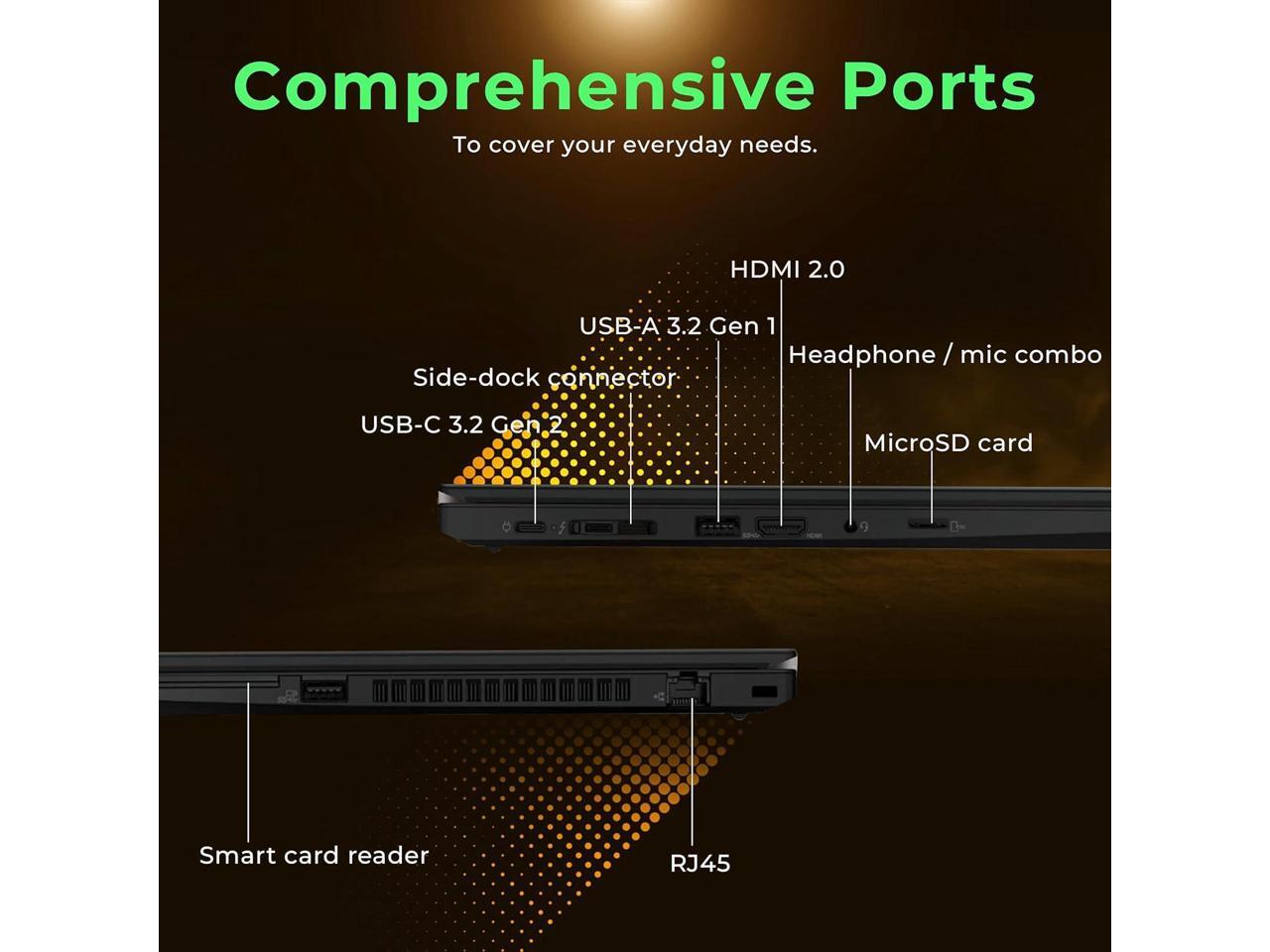 - Windows 11 ProUnleash your potential with an operating system tailored to meet professional demands! Port & Accessories2 x USB-A 3.2 Gen 1, 2 x USB-C Thunderbolt 4, 1 x MicroSD card reader, 1 x Headphone, 1 x HDMI, 1 x Kensington Security Slot. Black.