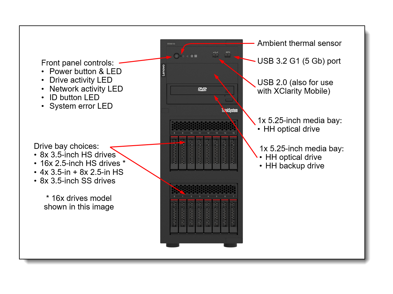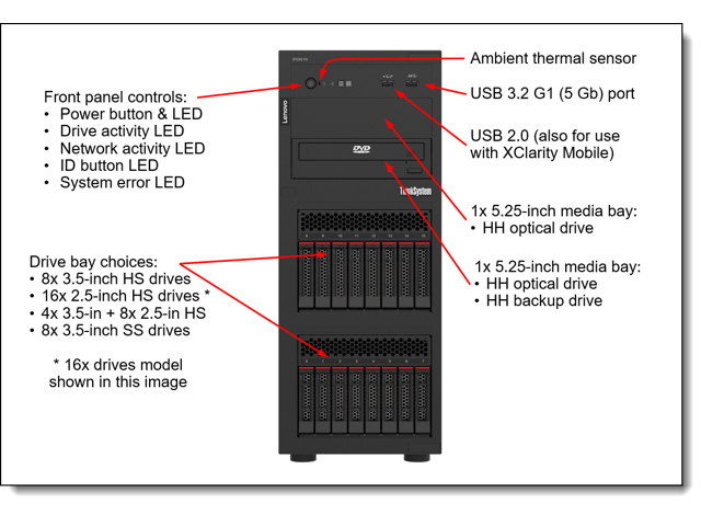 Lenovo ThinkSystem ST250 V3 7DCEA023NA Tower Server - 1 x Intel Xeon E-2434 3.40 GHz - 16 GB RAM - Serial ATA/600 Controller - Intel C266 Chip - 1 Processor Support - 128 GB RAM Support - TruDDR5 - Matrox G200 Up to 16 MB Graphic Card