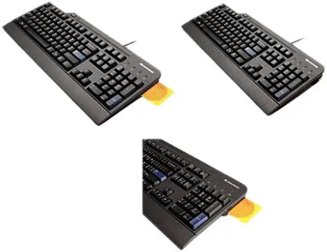 Lenovo USB Smartcard Keyboard features an integrated smartcard reader, adjustable tilt, and a two-meter cable to increase flexibility and comfort. The Lenovo USB Smartcard Keyboard can be used for identification systems, to secure banking transactions and logins and to secure web applications. A solid construction houses 104 quiet keys, including two Microsoft Windows keys. This business black keyboard is available in any major languages. Lenovo smart card readers are ideal for providing user authentication for applications such as network logon, e-government, secure e-commerce, and healthcare.