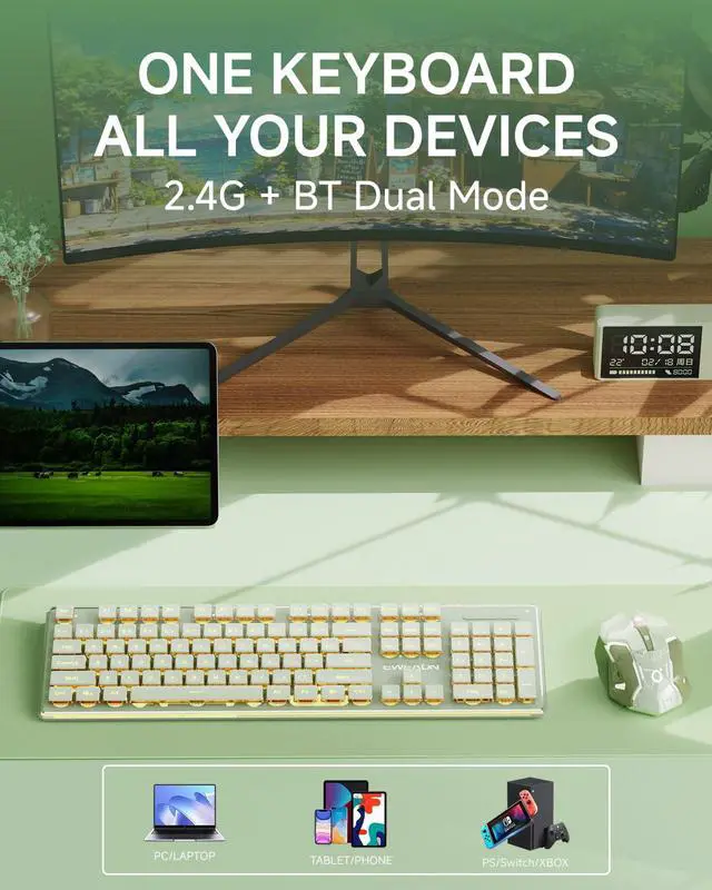 Two Connection Modes & Rechargeable: V3 wireless keyboard and mouse combo provide 2 modes, BT 5.0 & 2.4GHz, meeting your work, game & study needs. The cute keyboard and mouse wireless share a USB receiver to achieve a wireless connection of up to 10 meters (33 feet) without any drivers. Press wireless keyboard green FN+1/2/3 key combination to enter 2.4G/ BT 1/BT 2 mode. In addition, it is equipped with a Type-C cable. You can charge the green keyboard wireless, type and play games uninterrupted
