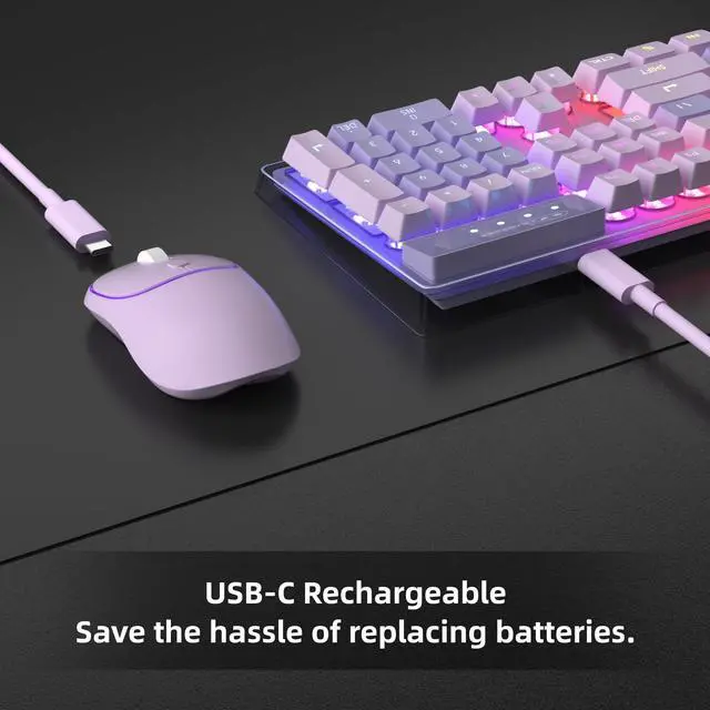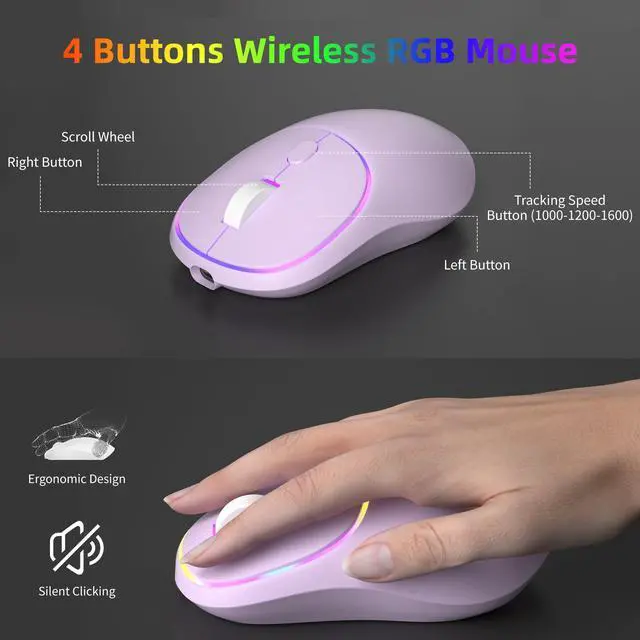 DYNAMIC RGB BACKLIGHT: The led keyboard has lots of different lighting settings - 5 light modes, 7 solid color backlights and 1 rainbow backlight, 3 brightness levels and 4 light speeds. The backlight can be turned off at any time. The keys are shine-through and easy to see in low-light environments. The wireless mouse features a gorgeous RGB light strip that adds vibrancy to the clean look.