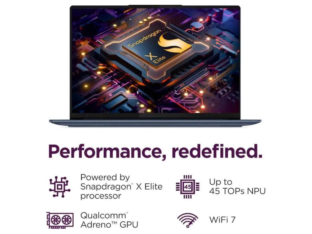 - [Processor & Graphics ] Snapdragon X Elite X1E-78-100 Up to 3.40GHz Processor (36MB Cache, 12-Cores, 12-Threads); Shared Integrated Graphics.