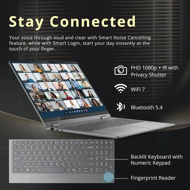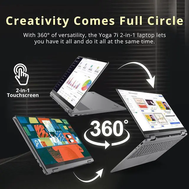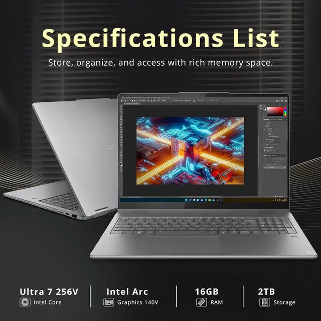 The Lenovo Yoga 7i 16" 2K 2-in-1 Touchscreen Laptop delivers versatile performance with an Intel Core Ultra 7 256V processor and Intel Arc Graphics, featuring a backlit keyboard, numeric pad, and fingerprint reader for secure, flexible productivity.