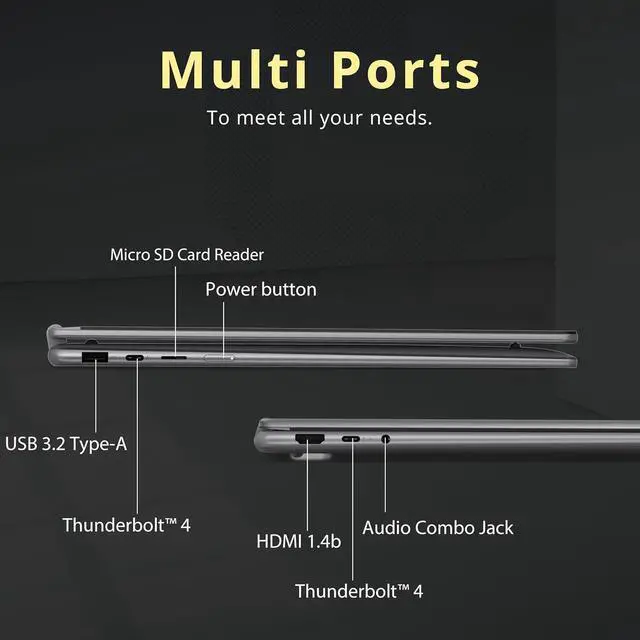 Windows 11 Pro: 14.21"x10.12"x0.67, 3.96 lbs. Ports: 1x USB-A, 2x USB-C, 1x HDMI 1.4b, 1x Headphone / microphone combo jack (3.5mm), 1x microSD card reader.Wi-Fi 7+Bluetooth 5.4. Bonus Docking Station Set: 1x 7-in-1 Docking Station with 1TB Storage, 1x 32GB MicroSD Card with Adapter, 1x Type-C Data Cable, 1x 3-in-1 Charging Cable, 1x Suede Cleaning Cloth.