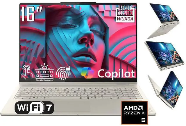 Lenovo Yoga 7 2-in-1 AI Business Laptop, 16" WUXGA Touchscreen Display, AMD Ryzen AI 5 340 (Up to 4.8 GHz), 16GB LPDDR5X RAM / 1TB SSD, Backlit Keyboard, Fingerprint Reader, Wi-Fi 7, Win11 Home