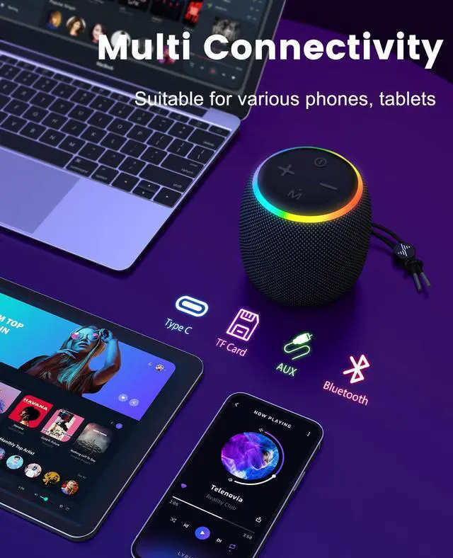 LENRUE Small Portable Bluetooth Speaker with Lights, TWS Stereo Surround Sound, Type C powered, Bluetooth 5.3, AUX TF Card Input, Wireless for Outdoor Home, Coolest Gifts