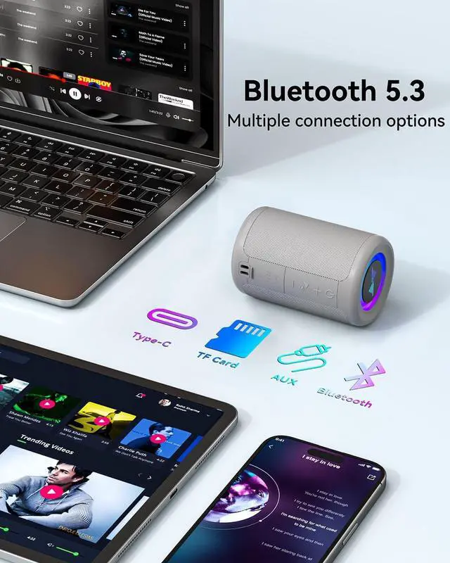 Versatile Connectivity: Equipped with the latest Bluetooth 5.3 wireless seamless connectivity, Type-C powered, AUX input, and TF card slot. All day playtime, compatible with multiple phone, offering flexible usage options for all your needs.