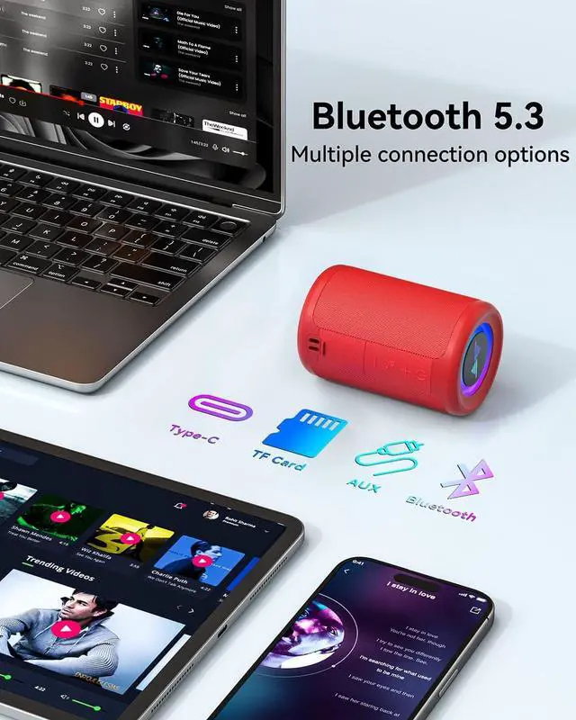 Versatile Connectivity: Equipped with the latest Bluetooth 5.3 wireless seamless connectivity, Type-C powered, AUX input, and TF card slot. All day playtime, compatible with multiple phone, offering flexible usage options for all your needs.