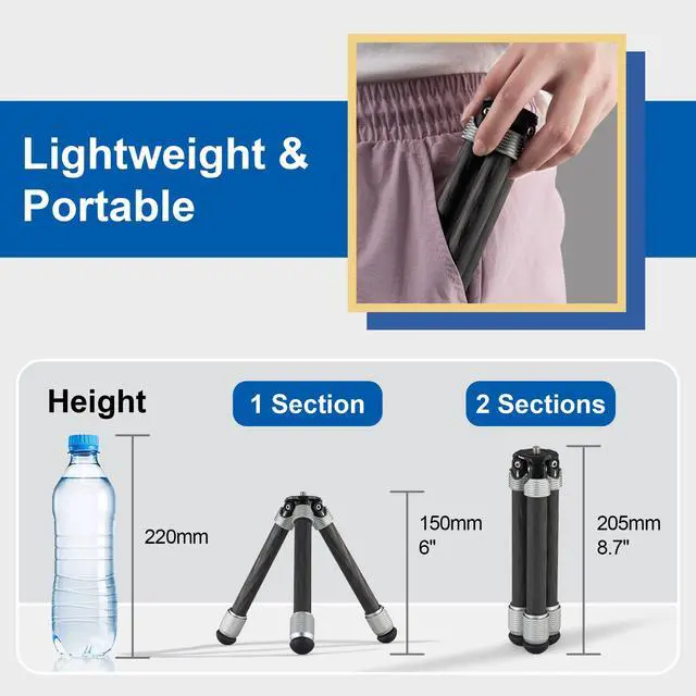 Lightweight and Portable: Tripod made of carbon fiber will be lighter and more durable than other metal/plastic products. Maximum height 205mm/8.07, however when folded it's only 6.6 inches long, small occupation space when put into the backpack