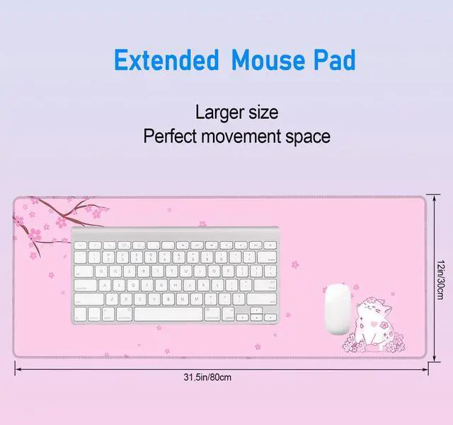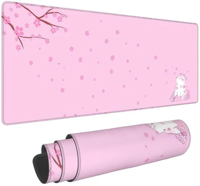 Cherry Blossom Cat Pink Mousepad, Cute Large Anime Gaming Desk Mat, Girly Office Decor Accessories Desktop Keyboard Pad for Women Girls, Aesthetic Japanese Sakura Mouse Mat, 31.5 x12in