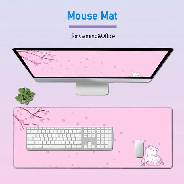 Cherry Blossom Cat Pink Mousepad,Cute Large Anime Gaming Desk Mat,Girly Office Decor Accessories Desktop Keyboard Pad for Women Girls,Aesthetic Japanese Sakura Mouse Mat,31.5x12in