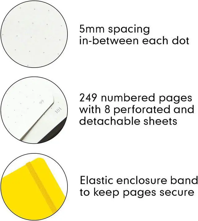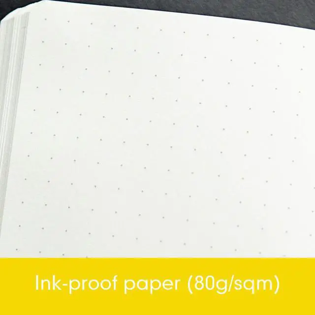 Dots with 5mm spacing providing guidelines for writing, creating tables and drawings and are so discreet that you could almost think the pages are blank.
