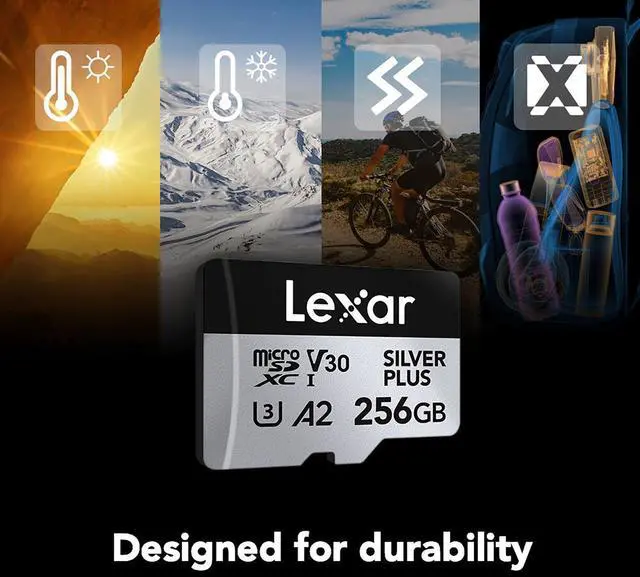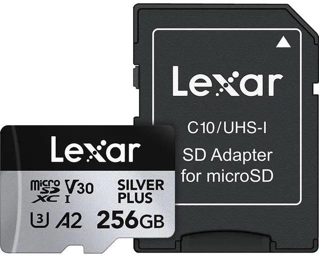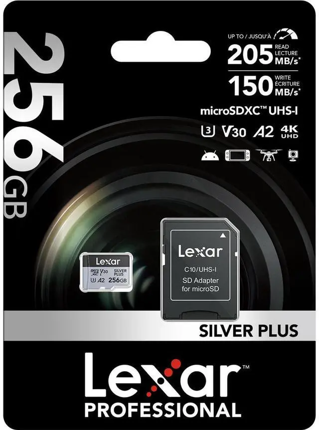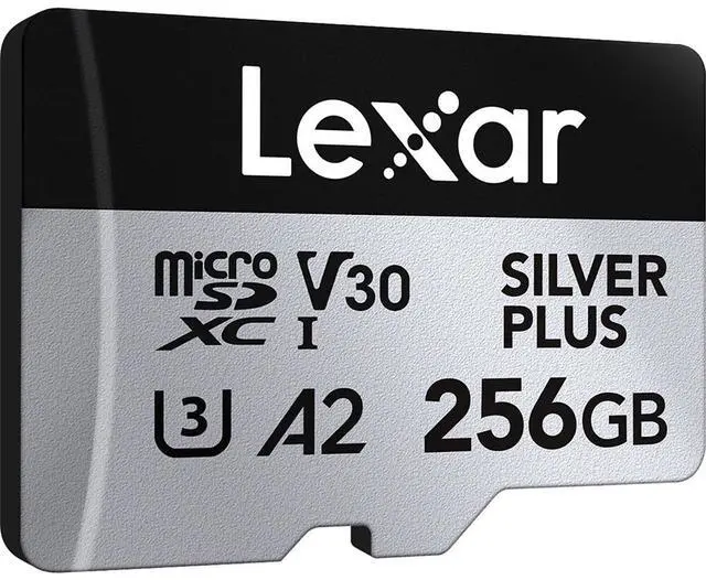 The Lexar 256GB Professional SILVER PLUS UHS-I microSDXC Memory Card offers 256GB of storage and utilizes the UHS-I bus to support Full HD and 4K/60p video recording. It's ideal for continuous shutter bursts, fast shooting, and both raw and JPEG captures. With maximum read speeds of up to 205 MB/s and write speeds up to 150 MB/s, it provides fast data transfer. The V30 speed class ensures that minimum write speeds never drop below 30 MB/s, making it a reliable option for high-performance tasks.