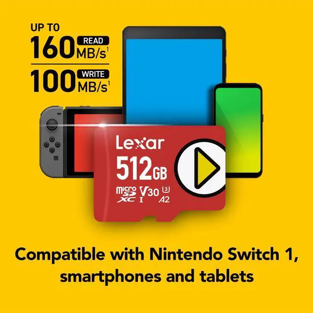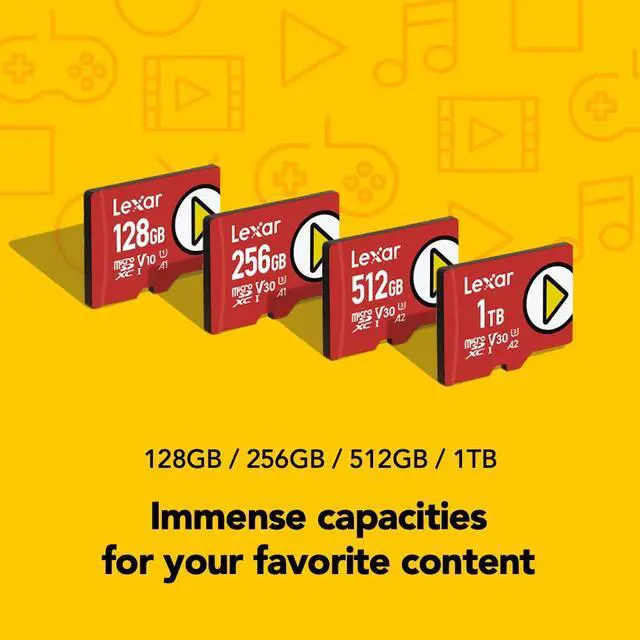 Lexar® PLAY microSDXC™ UHS-I cards are designed to keep up with all your content, no matter if they are games, movies, music or books. Avoid slow load times with read speeds of up to 150MB/s1 and fast A1 or A2-rated performance2, so you can play more of what you love without missing a beat. With large capacities up to 1TB you can save all your favorite multimedia files. Ideal for portable gaming devices, smartphones, and tablets.