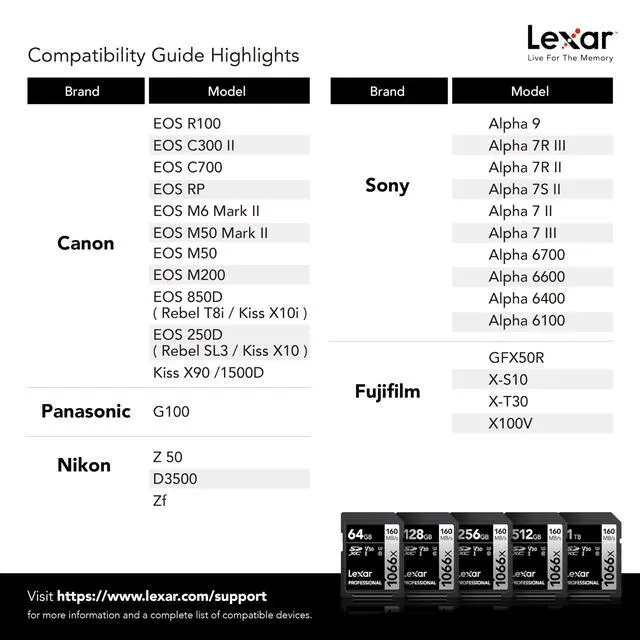 Designed for your DSLR or mirrorless camera, the Lexar Professional 1066x SDXC UHS-I Card SILVER Series lets you quickly capture and transfer high-quality photos, including Full-HD and 4K UHD video with speeds 160MB/s read, and 70MB/s write. These cards dramatically accelerate workflow from start to finish maximizing your creativity.