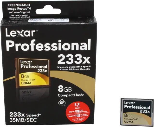 The Lexar Professional 233x Compact Flash memory card provides reliable, professional-level performance, with a guaranteed minimum sustained write speed of 233x (35MB/s), so you can capture and store high-quality images and video with your DSLR camera.