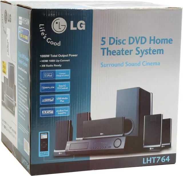 The LG LHT764 home theater system jump-starts your media pleasure, turning your medium-sized room into a virtual cinema! This system includes LG's full-featured Receiver/5-disc changer and 6 speakers. With full support for iPod and Satellite radio (separate antenna and subscription required), DivX movies, and digital photo playback, you'll never be left wanting for entertainment options!