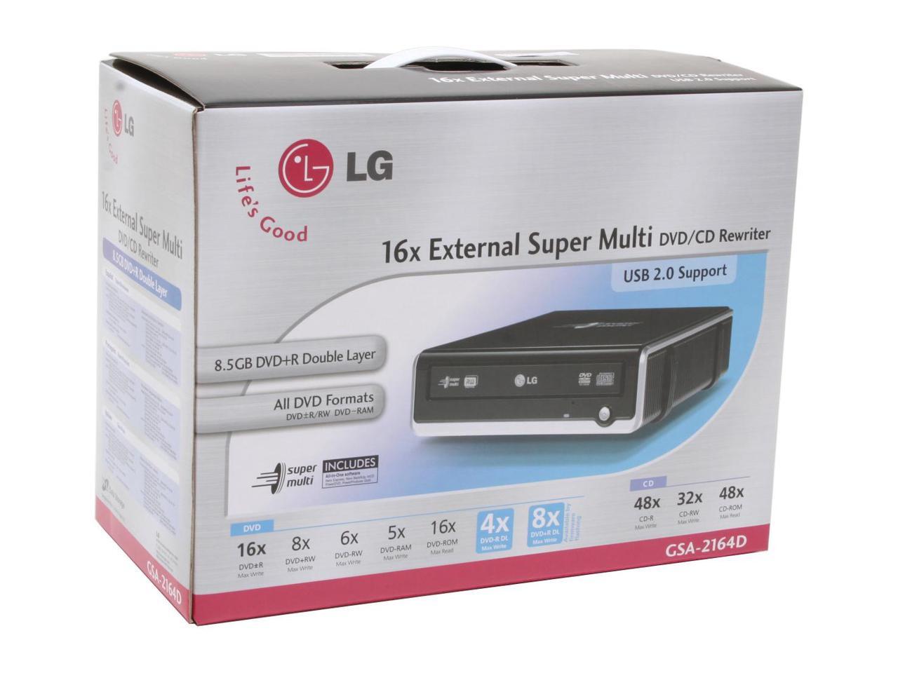 LG Black 16X DVD+R 8X DVD+RW 8X DVD+R DL 16X DVD-R 6X DVD-RW 5X DVD-RAM 16X DVD-ROM 48X CD-R 32X CD-RW 48X CD-ROM 2M Cache USB 2.0 External DVD Burner Model GSA-2164D