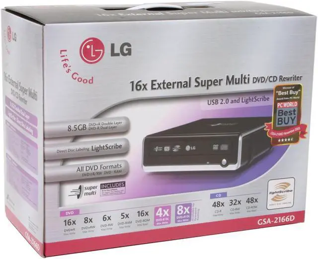 Introducing the GSA-2166D, 16x External Super-Multi Triple Format Optical Disk Drive. With an incredible 16x max DVD burn speed, and 5x DVD-RAM, you'll never have to worry about compatibility because this drive is compatible with all DVD formats. Double Layer DVD+R (8.5GB) and dual layer DVD-R (8.5GB) recording is also supported. Burn Fast, Burn Right with the LG GSA-2166D.