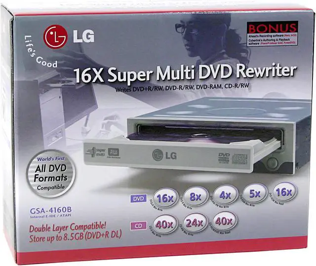 Introducing GSA-4160B, the latest LG Super Multi Triple format drive. With an incredible 16X max DVD burn speed, and 5X DVD-RAM, you'll never have to worry about compatibility because this drive is compatible with all DVD formats. It supports Double Layer DVD+R(8.5GB) and has CD-R/-RW speeds of 40x24x40. Burn Fast, Burn Right, Burn All with the LG GSA-4160B.