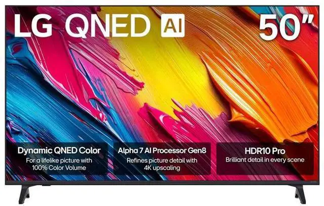LG 50" 4K QNED TV - QNED70AUA Series - Dynamic QNED Color - Direct Backlight - 4K Ultra HD (3, 840 x 2, 160) Resolution - 60Hz Native - Dynamic Tone Mapping - Filmmaker Mode - HDR10 / HLG - a7 AI Processor 4K Gen8 - 4K Super Upscaling - VRR Up to 60Hz - ALLM - Game Optimizer - HGIG Mode - Voice Assistance - Matter - AI Concierge - USB Camera Compatible - Game Service - Music Service - Home Office - Google Cast built-in - Full Web Browser - Home Hub - Intelligent Voice Recognition - LG Channels - App Store - ThinQ Smart Technology - webOS 25 - Sports Alert - Auto Volume Leveling - Wow Orchestra - a7 AI Sound Pro - Bluetooth Surround Ready - LG Sound Sync - Down Firing Speakers - 2.0 Ch - Sound Mode Share - 1 x SPDIF - Bluetooth 5.0 - 1 x Ethernet - eARC - 3 x HDMI - Simplink - IP Control - 1 x RF - Smartphone Remote App - 1 x USB - Wi-Fi 5 - AC 120V, 50/60Hz - 200 x 200