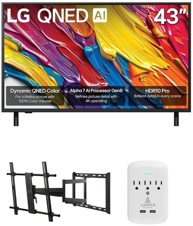 LG 43QNED82AUA 43 Inch QNED AI 4K Smart TV with a Walts Large/Extra Large Full Motion Mount and Amber Protection 3-OUTLET-SURGE Surge Protector (2025)