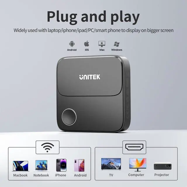 4K@60Hz Ultra Clear Experience: UNITEK 4K Wireless HDMI Adapter supports 4K decoding, delivering stunning 4K@60Hz high-definition output, and also combines with 5G + 2.4G WiFi bands. Ensures the most real original color and smoothest transmission. Perfect for home theater, live sport match, live meeting and online teaching.