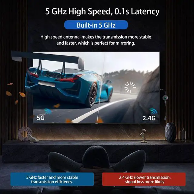Thanks to excellent connection stability, you don't have to worry about screen projection interruptions or image delays due to weak signals. It uses advanced dual-band WiFi technology, which can intelligently switch frequency bands to avoid network congestion and ensure stable signal transmission. Whether it is training, office meetings or online training, the 5G screen projector can handle it easily.