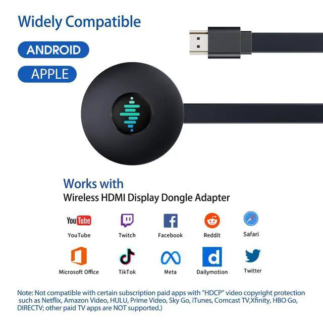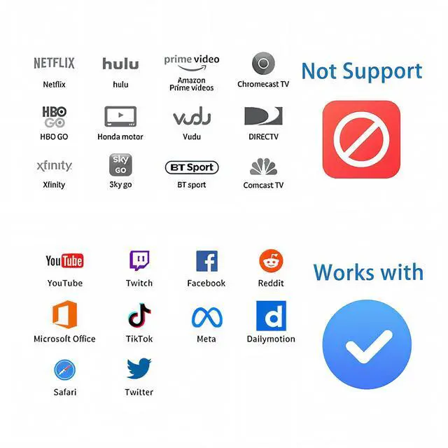 • i-OS devices: support non-subscription apps like YouTube, Tiktok, Office, Safari, FaceTime, do not support "HDCP" copyright apps including NEFLIX, prime Video, DIRECTV, etc.