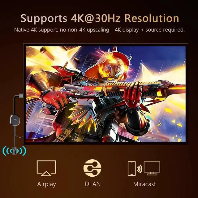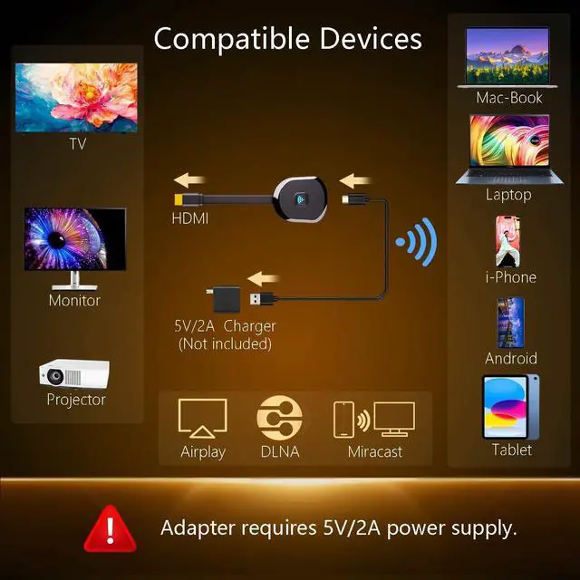 Wireless & Effortless to Set Up: Skip app installs and Bluetooth pairing entirely; simply connect the wireless HDMI adapter to your TV and supply power through the TVs 5V/2A USB port. All necessary operation details will be shown clearly on your TV display right away.