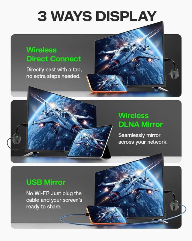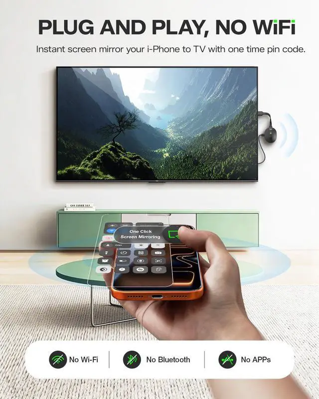 No Wi-Fi Required, Direct ConnectionMirror your phone to your TV wirelessly using a one-time PINonly iosno home Wi-Fi, Bluetooth, or extra apps needed. Perfect for locations without internet, like basements or hotel TVs. This wireless HDMI display adapter also features DLNA Mirror mode for s*treaming video directly from supported apps in extended screen mode. For the fastest setup, use USB Mirror mode, simply plug in a USBC cable to mirror instantlyno HDMI cable or adapter necessary.